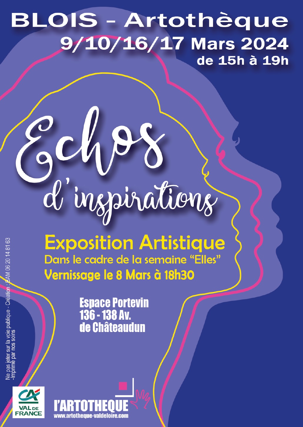 Nous vous attendons nombreux au vernissage qui aura lieu le vendredi 7 mars 2025 à 18h30 à l'Espace Portevin au 138 avenue de Châteaudun à Blois.